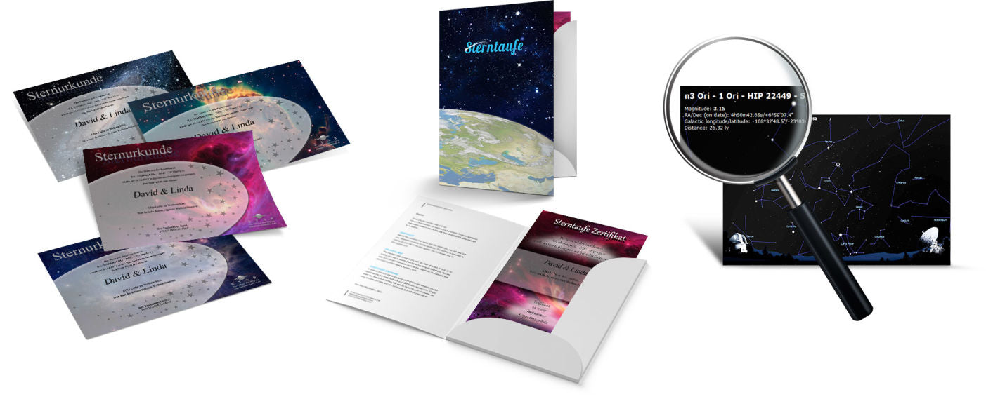 Zudem erhalten Sie einen Eintrag im Sterntaufenregister. Anhand der Taufnummer, die Sie auf Ihrem Zertifikat finden werden, können Sie Ihren Eintrag jederzeit und weltweit einsehen.